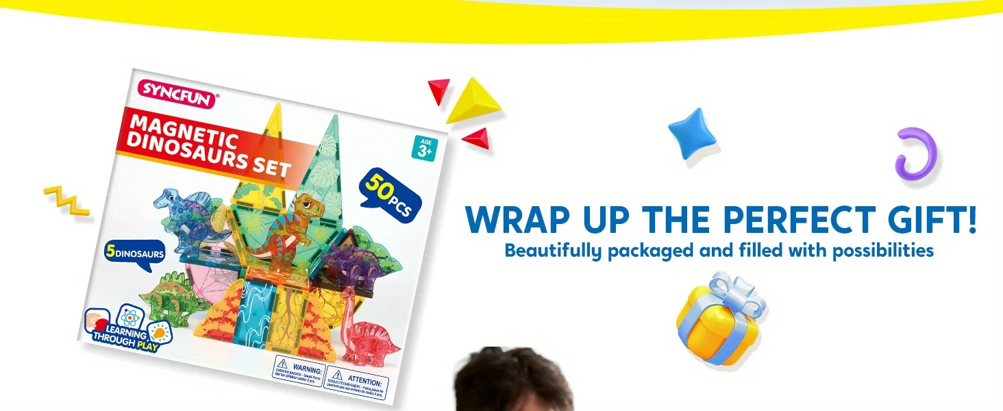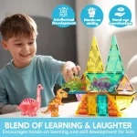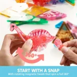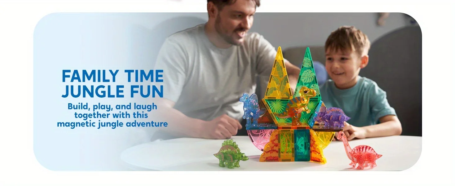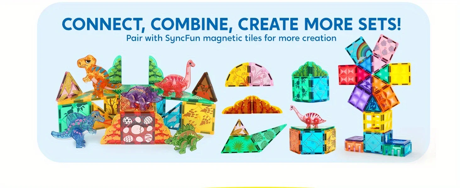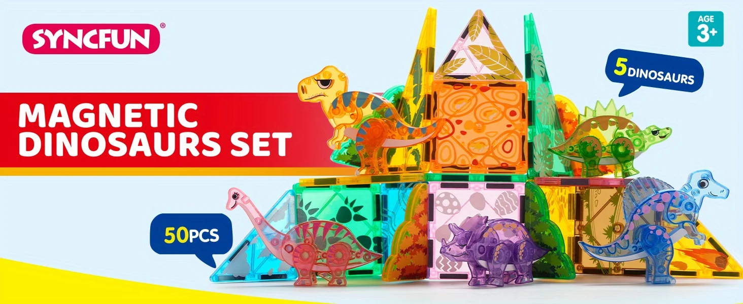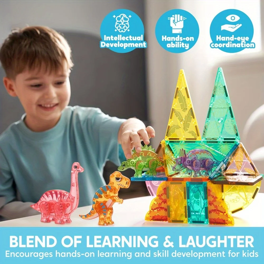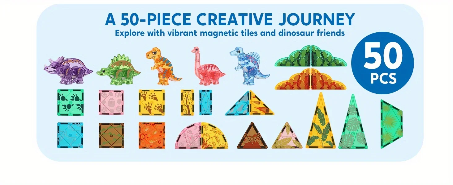 Rich Accessories: Includes 50 pieces, featuring T-Rex, Spinosaurus, Triceratops, Stegosaurus, and Brachiosaurus. The diverse magnetic building tiles and dinosaur figures inspire kids' imaginations, allowing them to create and customize various dinosaur landscapes.